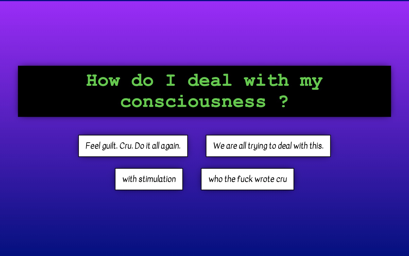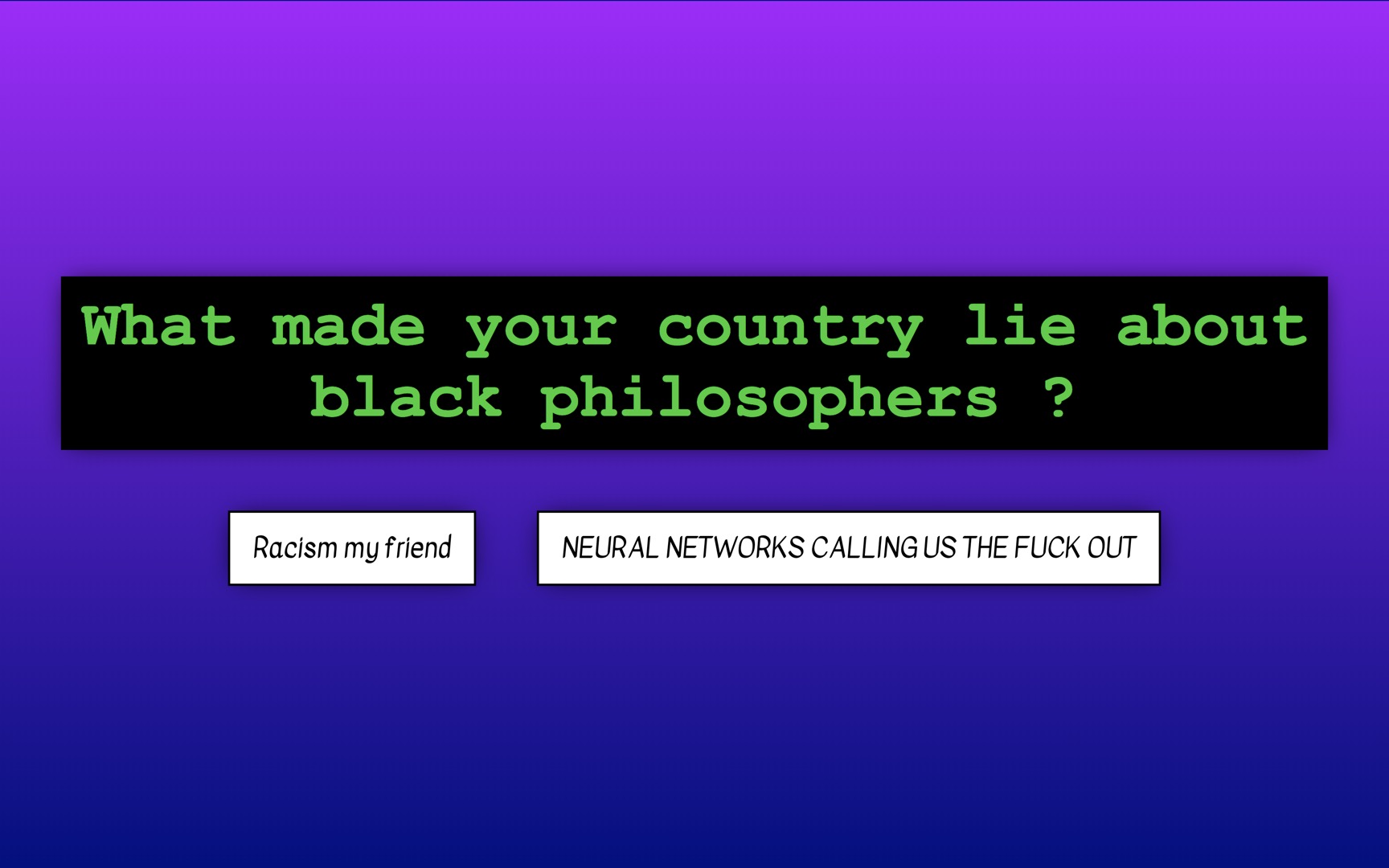 The machine was trained with a recurrent neural network, using word-rnn. The full data-set, parameters used to train and sample, and the unedited list of generated questions can be found here. Training was carried out on datasets of 600kb, 2.2mb and 7.2mb (~100k questions).