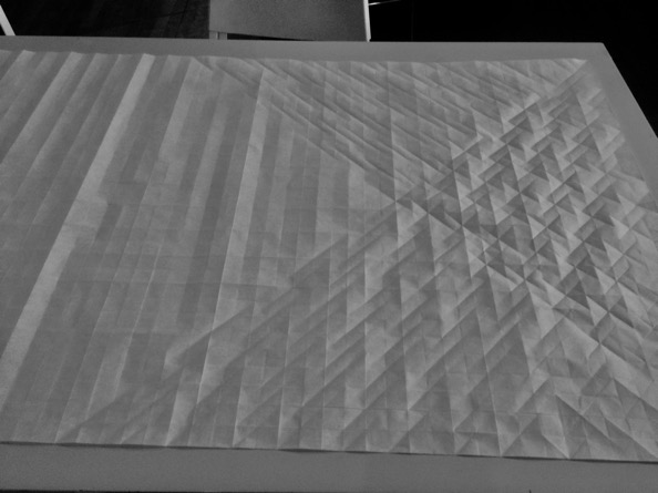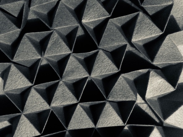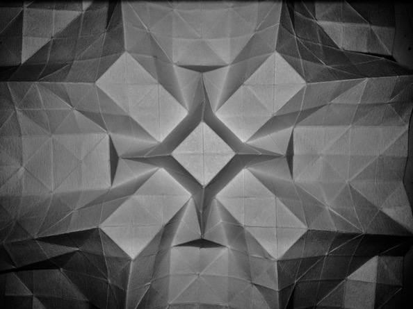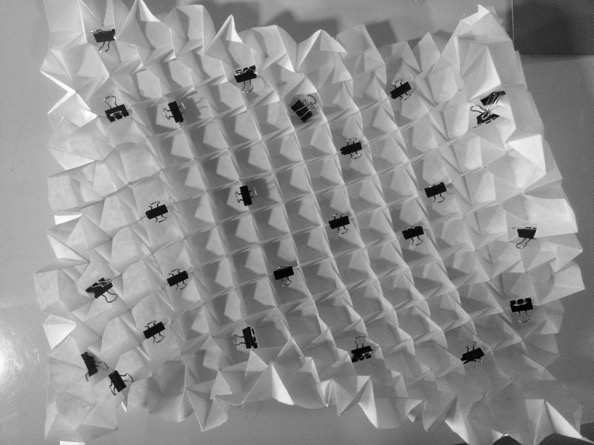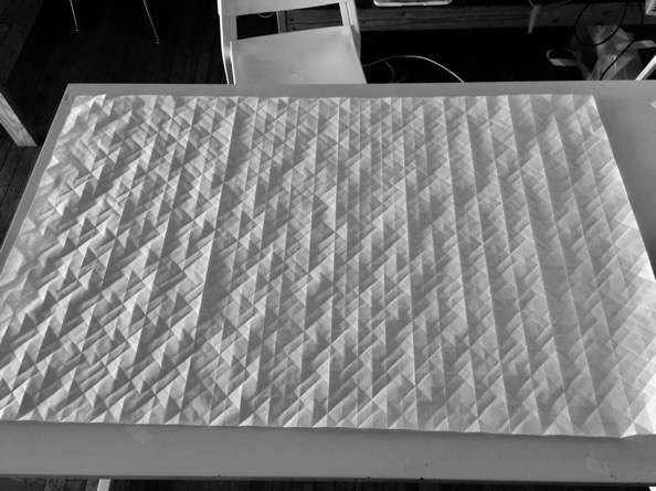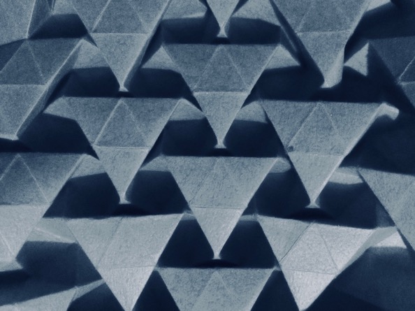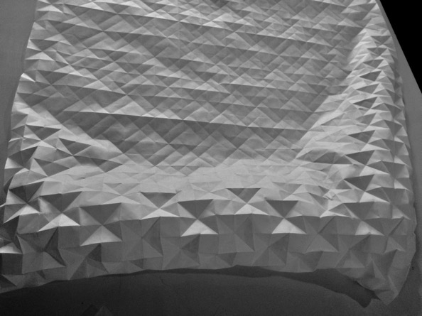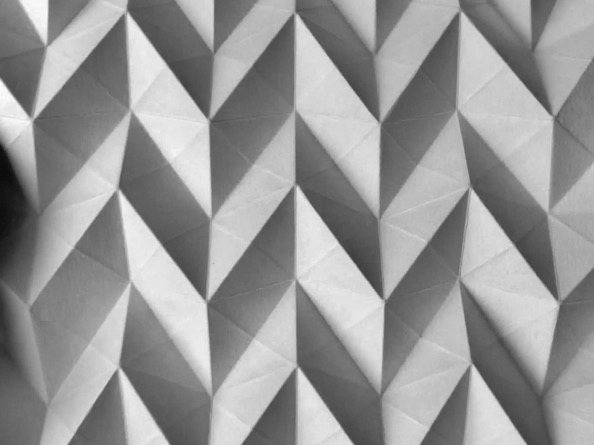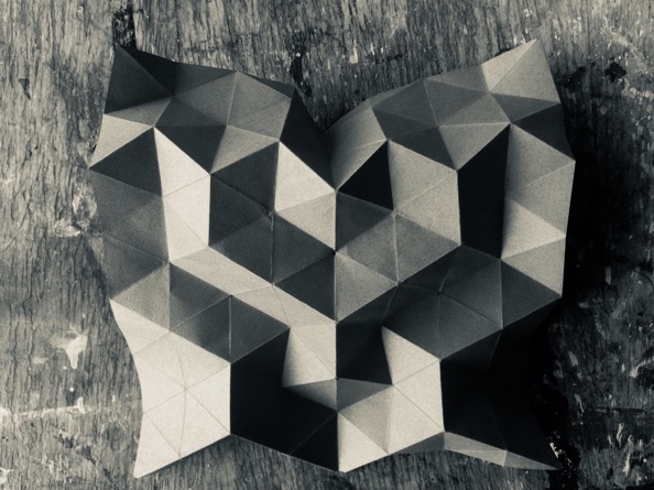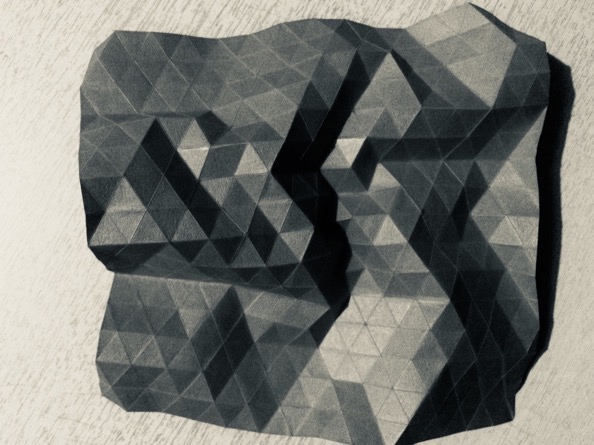 The intention of this project was to focus on process and exploration; revisiting an old interest in Origami through the lens of computational geometry. The folded pattern is known as the Water Bomb tessellation, discovered by Ron Resch, and is a kind of meta-material — exhibiting properties that are not inherently present in the paper itself — such as the compression along one axis leads to the expansion along another.